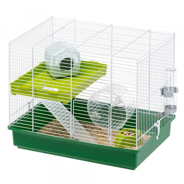 Dodává se s příslušenstvím, kterým je napaječka, miska a kolo na běhání. Součástí je také plastové patro s domečkem jako odpočinkovou zónou pro vašeho křečka, která je se spodním patrem propojena žebříkem.
