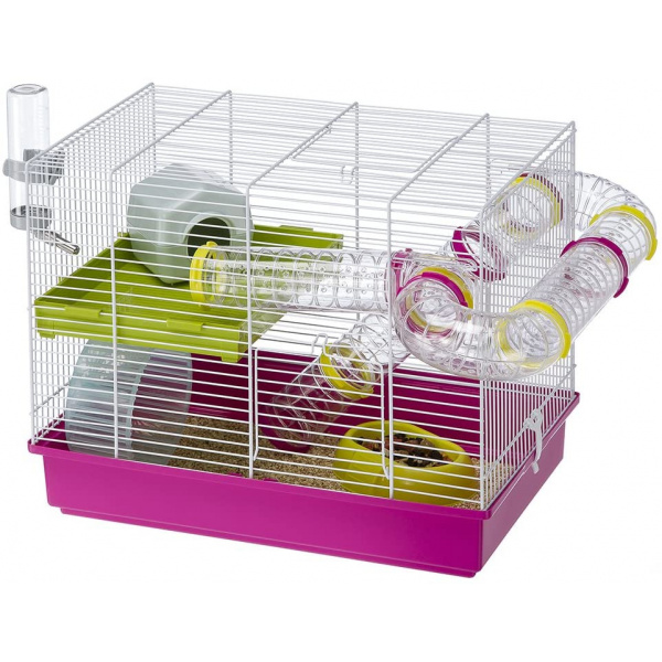 Je vybavena příslušenstvím pro křečky včetně domečku, misky, pítka, plastového kola, a také průhlednými tunely, ve kterých může váš malý hlodavec běhat a bavit se. K síťovině je připevněna užitečná plastová police, která vytváří malou relaxační zónu pro vašeho malého přítele.