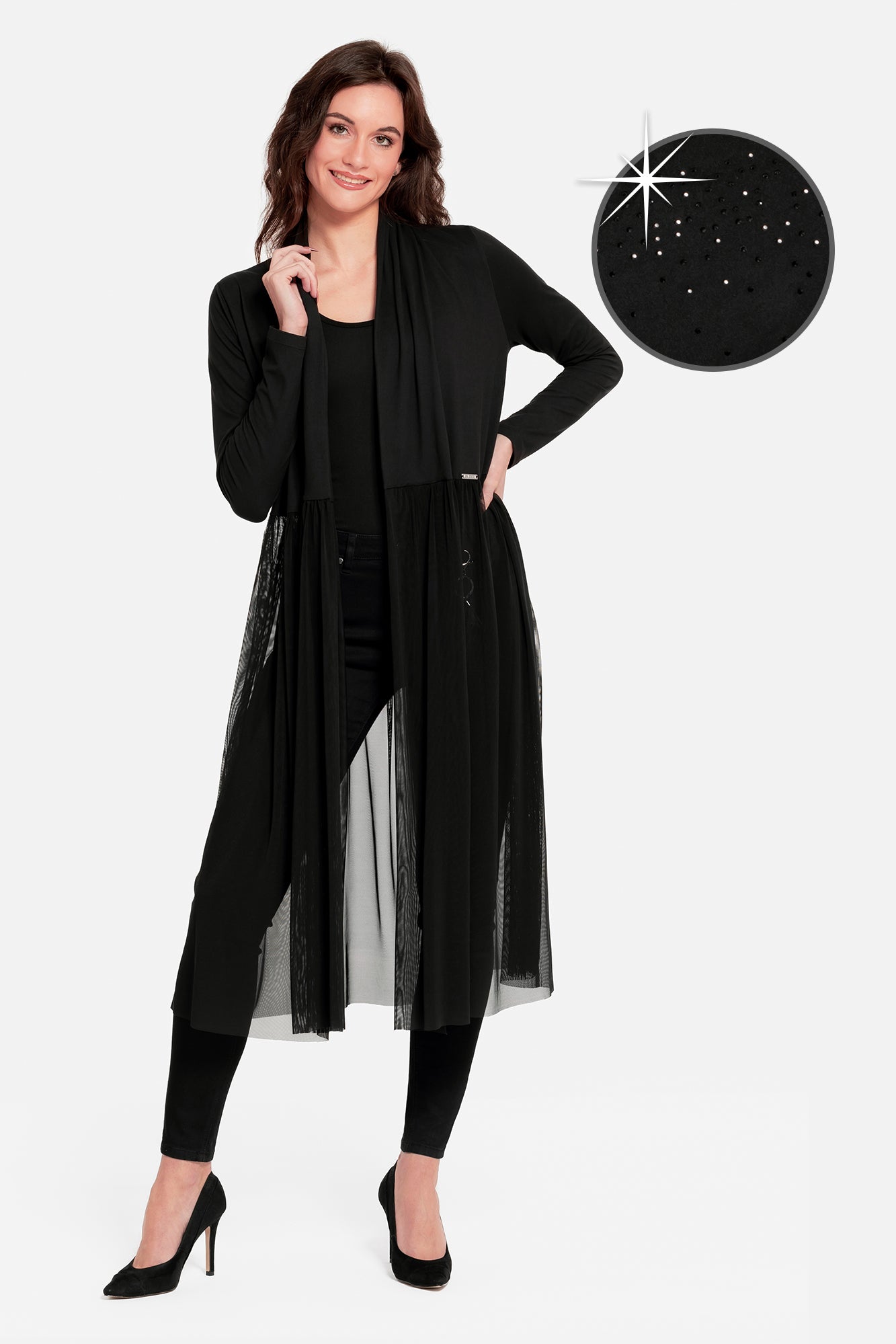 Elegantní dlouhý kardigan s průsvitným závojem a krystaly